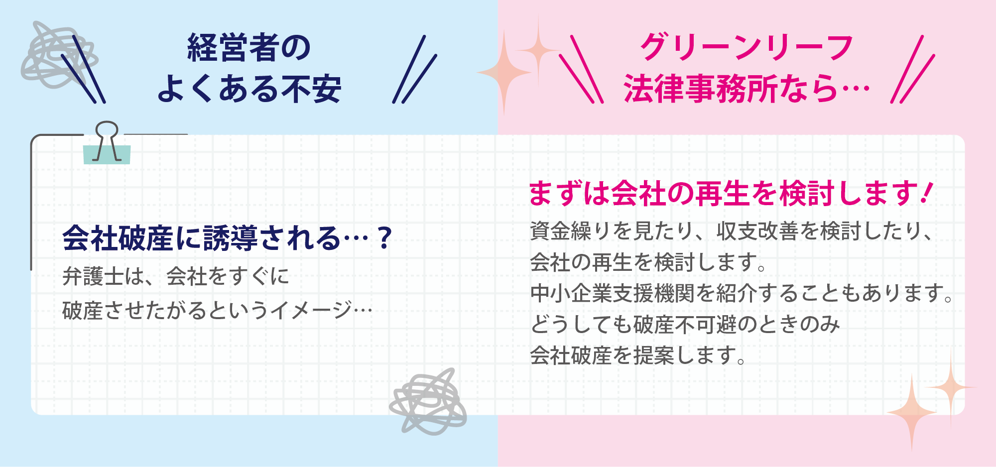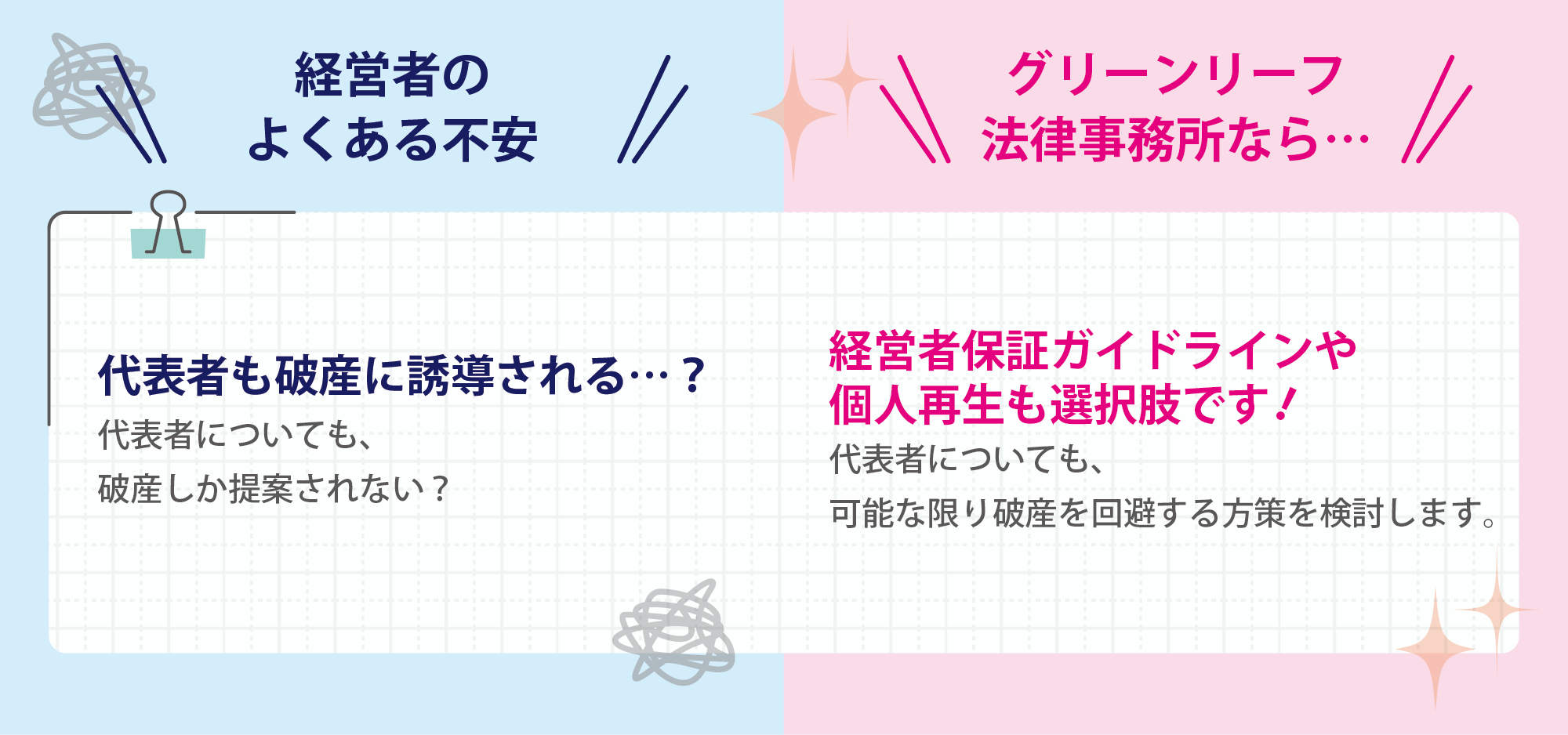 そして何より、経営者の方の経済的再建をもっとも重視しています。 グリーンリーフ法律事務所は、誠実な経営者の味方です。